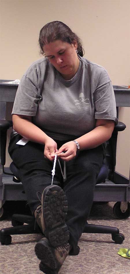 TREC teacher, Stacy Golden, practices her knot tying! (Field Skills - Denver, CO.)