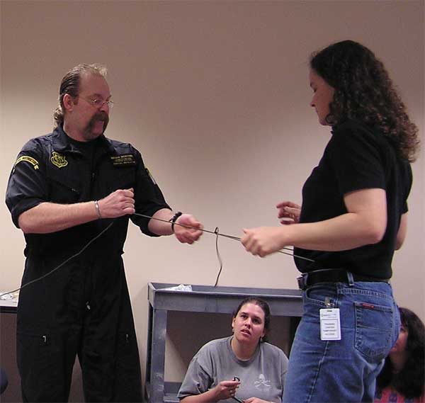 TREC teacher, Laurie Carr, gets tied up by Instructor, Brian Horner.   (Field Skills - Denver, CO.)
