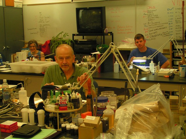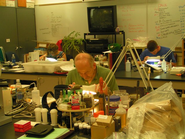 The picking and sorting process in the lab. Professor Pinkham, Kathleen Wright, and Casey Bell